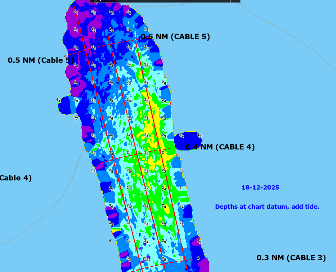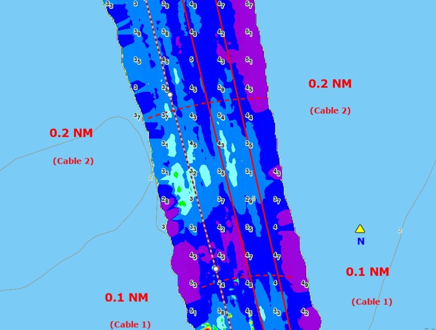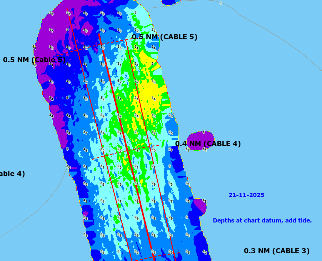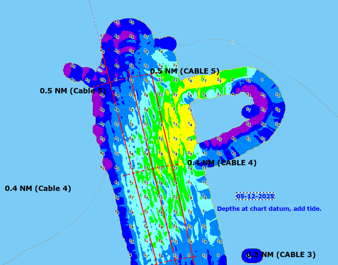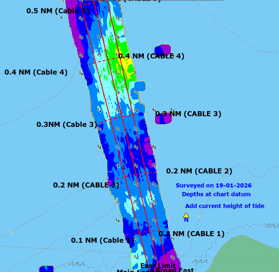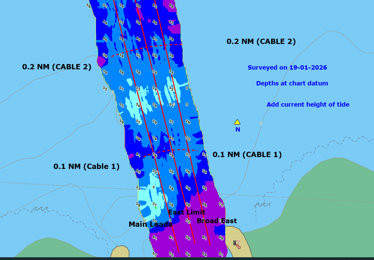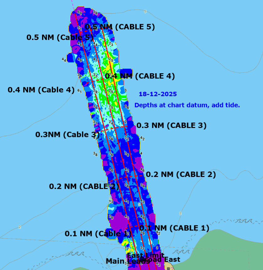 - East Limit: By day a line with the first black and white pole (to the east of the front lead) in line with the rear lead. At nighttime this pole has a red fluorescent lamp, which is to be in line with the rear lead green neon